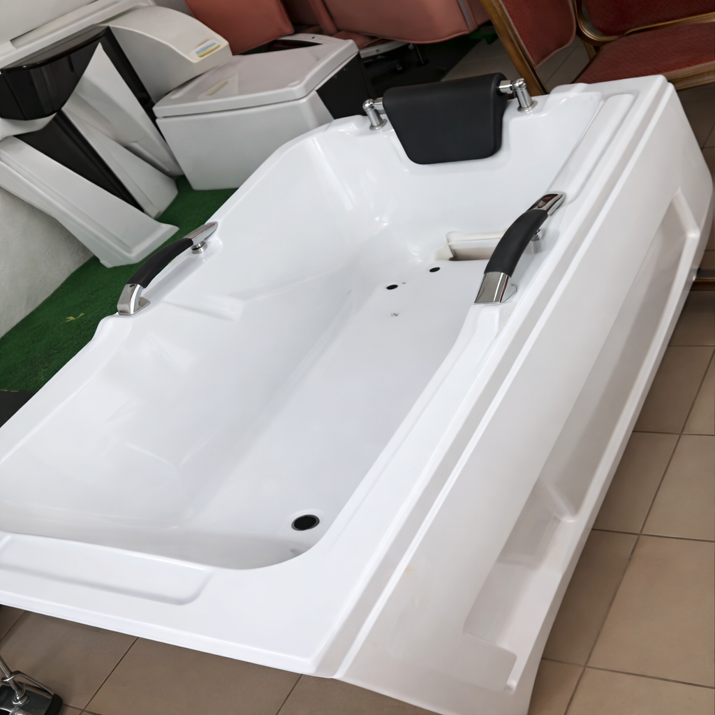 Cette baignoire rectangulaire en acrylique renforcé fibre verre (ép. 4-5mm) offre tablier avant moulé pour pose encastrée facile, appui-tête ergonomique noir, et barre d’appui chromée sécurisée. Capacité 220-260L, vidage central, surface lisse isolante thermique/antidérapante/antibactérienne. Idéale salle de bain standard, entretien simple sans produits abrasifs.