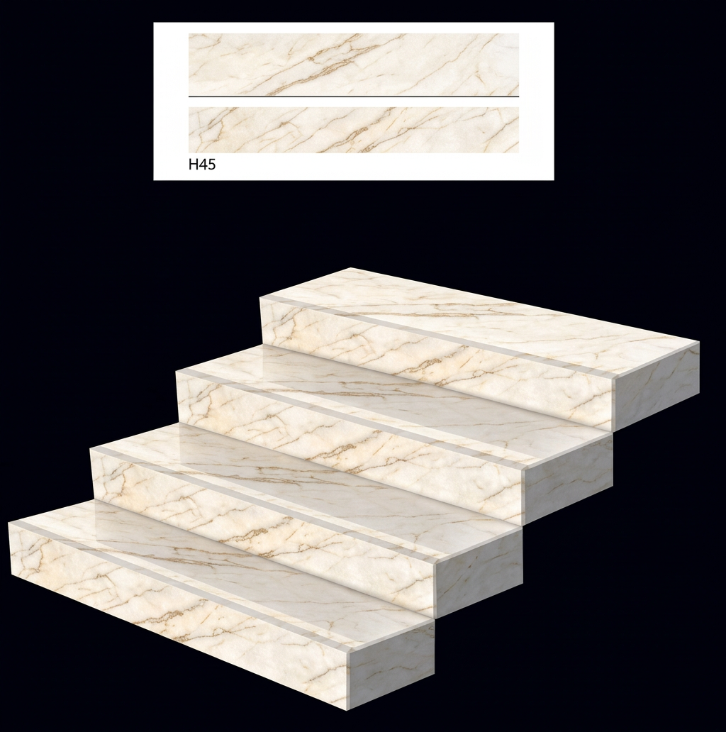 Carreaux d’escalier 100 x 30 cm effet marbre crème, avec nez antidérapant pour marches sécurisées et élégantes.
