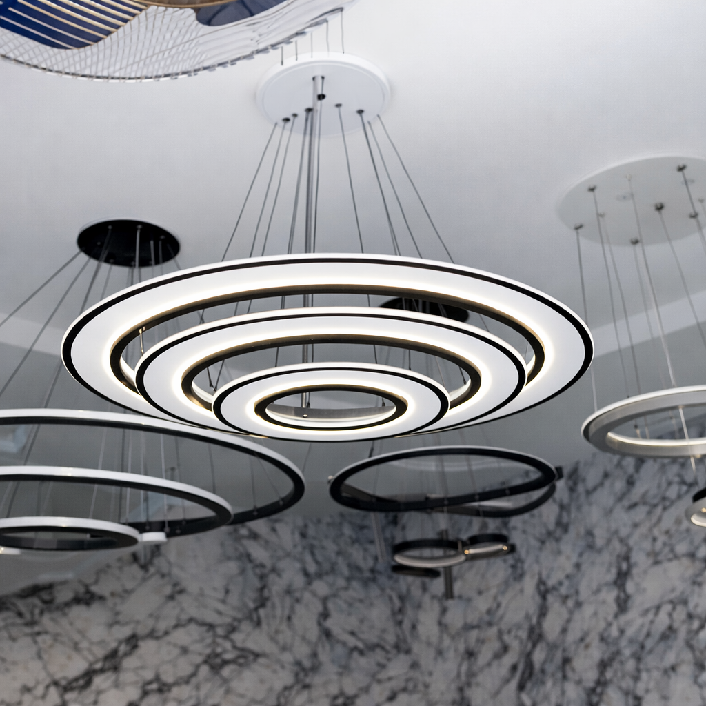 Lustre multi-anneaux LED blancs/noirs sur cordes – cascade moderne